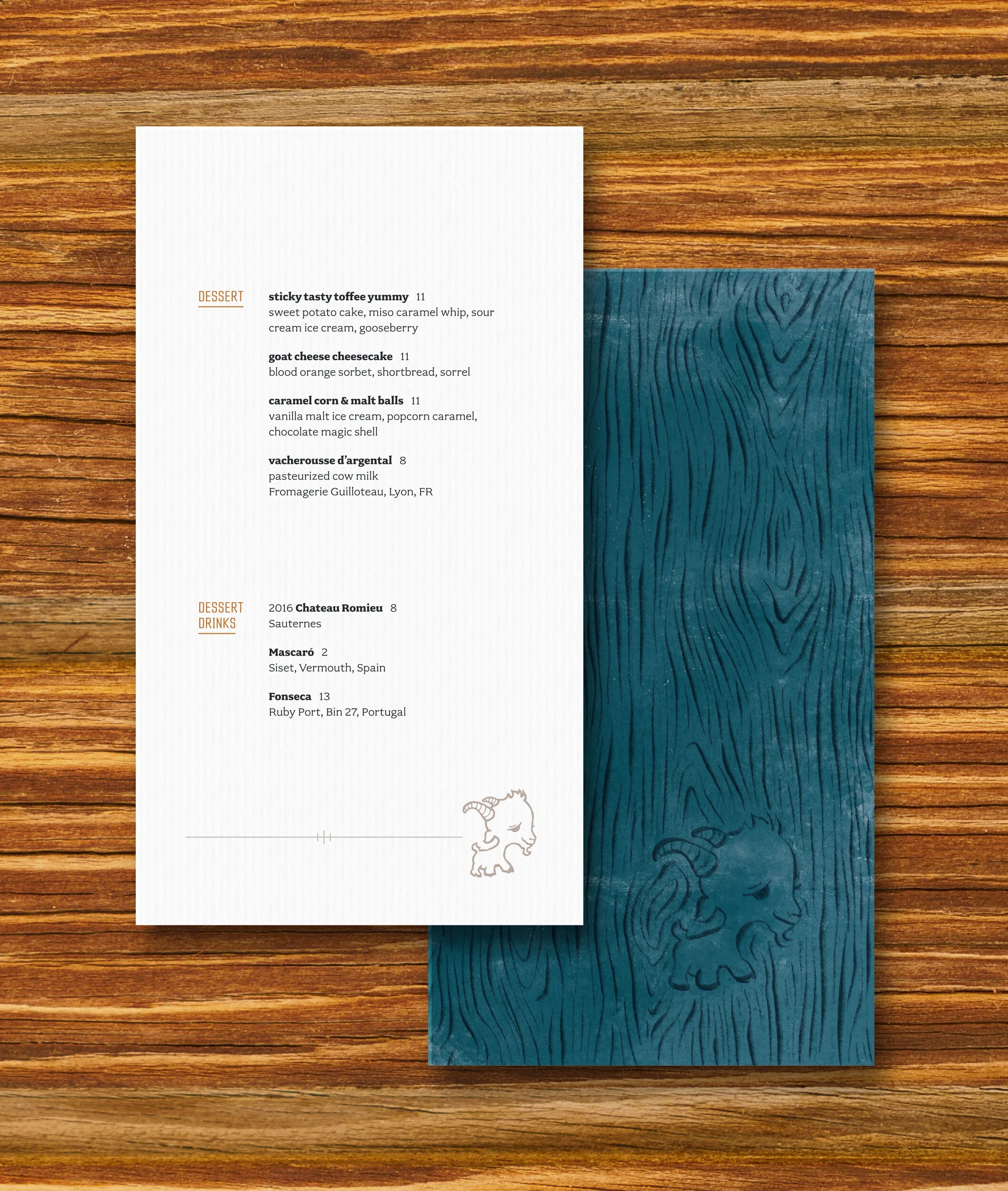 I also kept the overall menu layout very structured. On the back of the menus there is a very loose drawing of the famous goat logo hidden within a woodgrain texture—a call back to all the wood used throughout the restaurant interior.